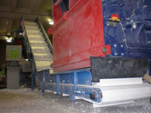 Конвейерная линия на базе Z-образных конвейеров с модульной лентой для подачи макулатуры (бумаги) на измельчитель (шредер) и последующей подачи измельченной макулатуры в пресс.